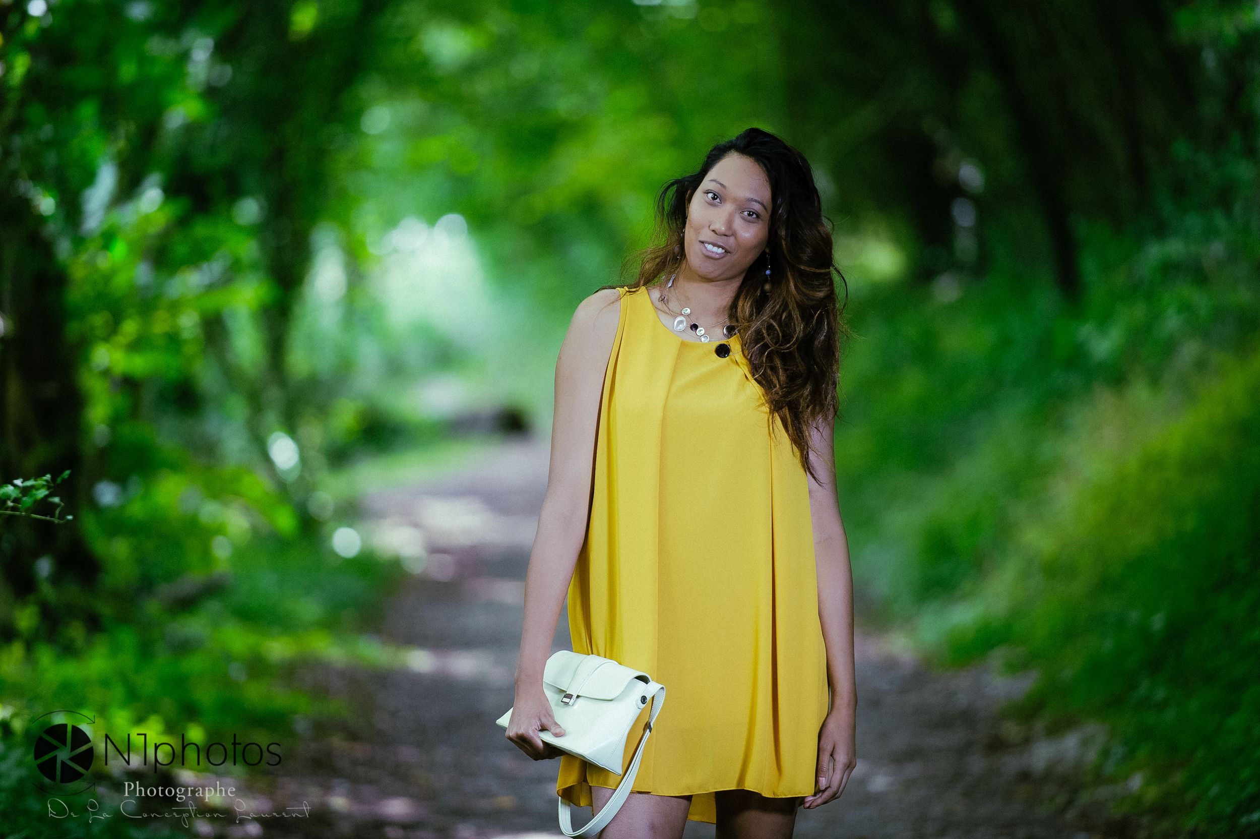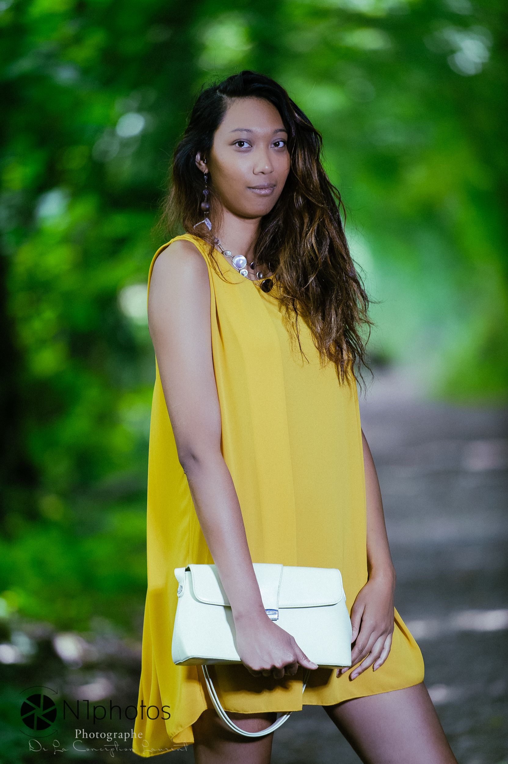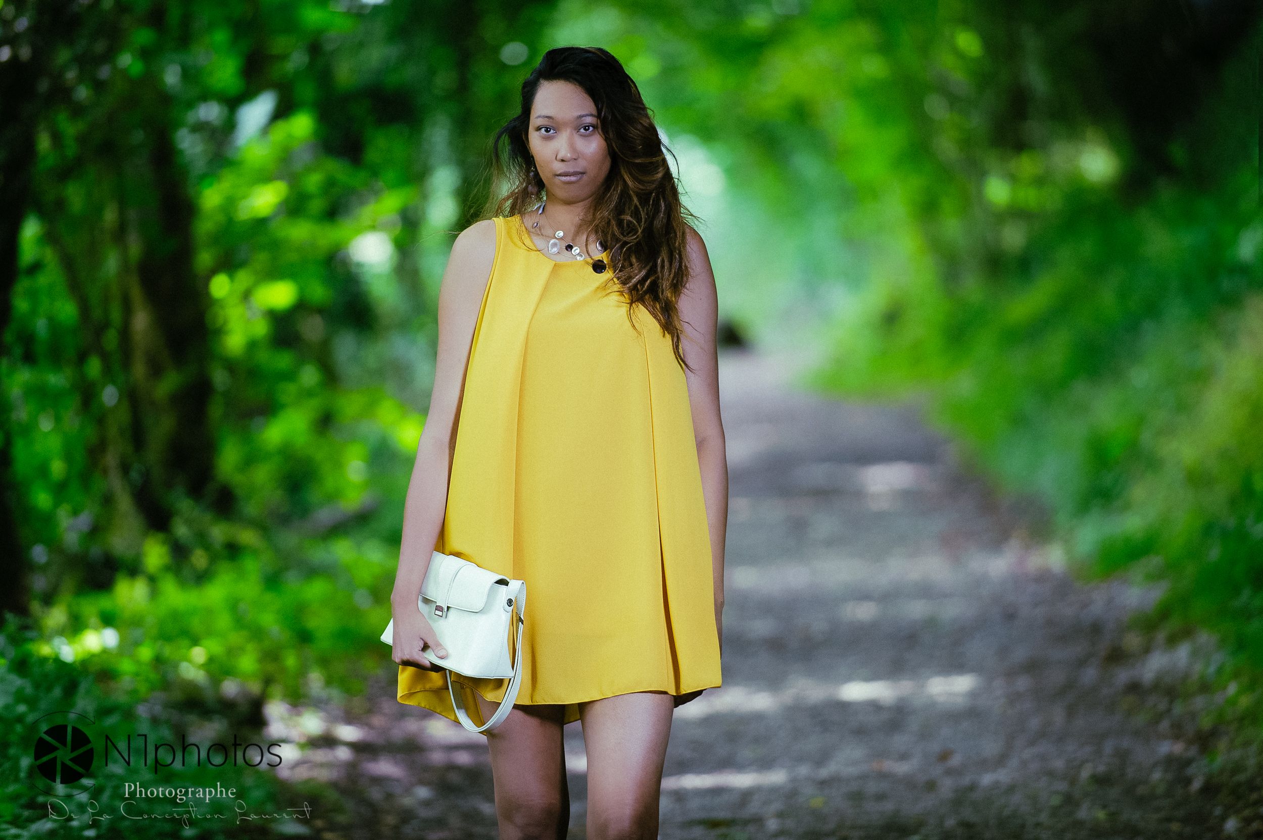 À l’occasion de ce shooting en extérieur, Mi a été habillée par une robe jaune de chez Ober boutique. Le décor naturel vert et gris a été choisi pour offrir un contraste intéressant à la couleur de la tenue. Pour sublimer l’ensemble, un sac et des chaussures assorties ont été sélectionnés, augmentant ainsi la brillance de la couleur. Le tout forme une tenue d’été ou de mi-saison parfaite pour les journées ensoleillées. La robe et ses accessoires blancs qui ont été chinés en friperie disposent d’une coupe fraîche et moderne qui apporte encore plus d’élégance au modèle.